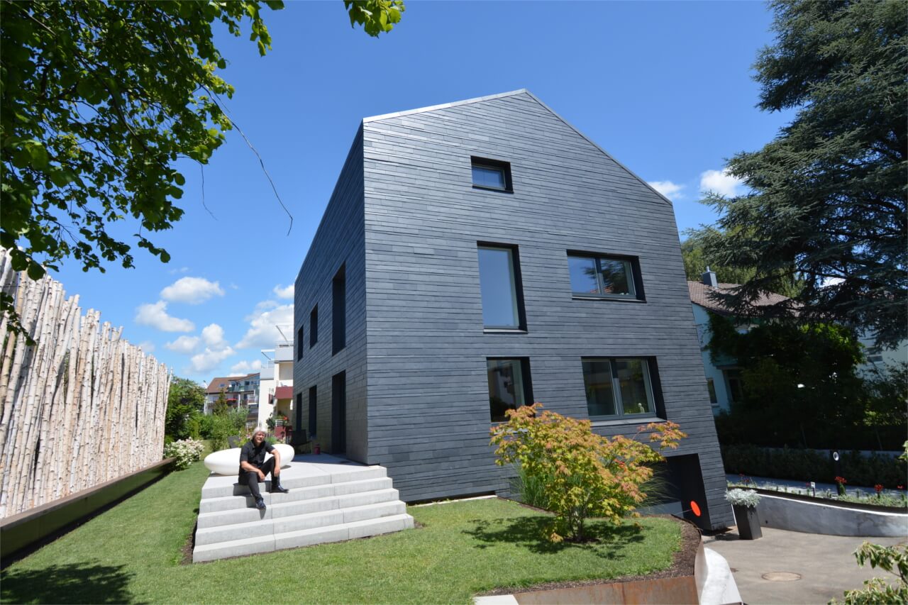 Dynamisch modern: Für den Umbau einer Nachkriegsimmobilie in ein modernes Designerhaus nutzte der Friedrichshafener Architekt Uwe Schwarz dunklen Schiefer. Durch den Einsatz unterschiedlich breiter rechteckiger Schiefersteine entstand eine lebendige Dach- und Fassadenstruktur, die als „Dynamische Deckung“ Einzug in die zeitgemäße Architektur hielt. Mit dem Stand der Sonne verändern die Steine ihren seidigen Glanz und die Farbe wechselt zwischen sanftem Anthrazit und edlem Blaugrau.