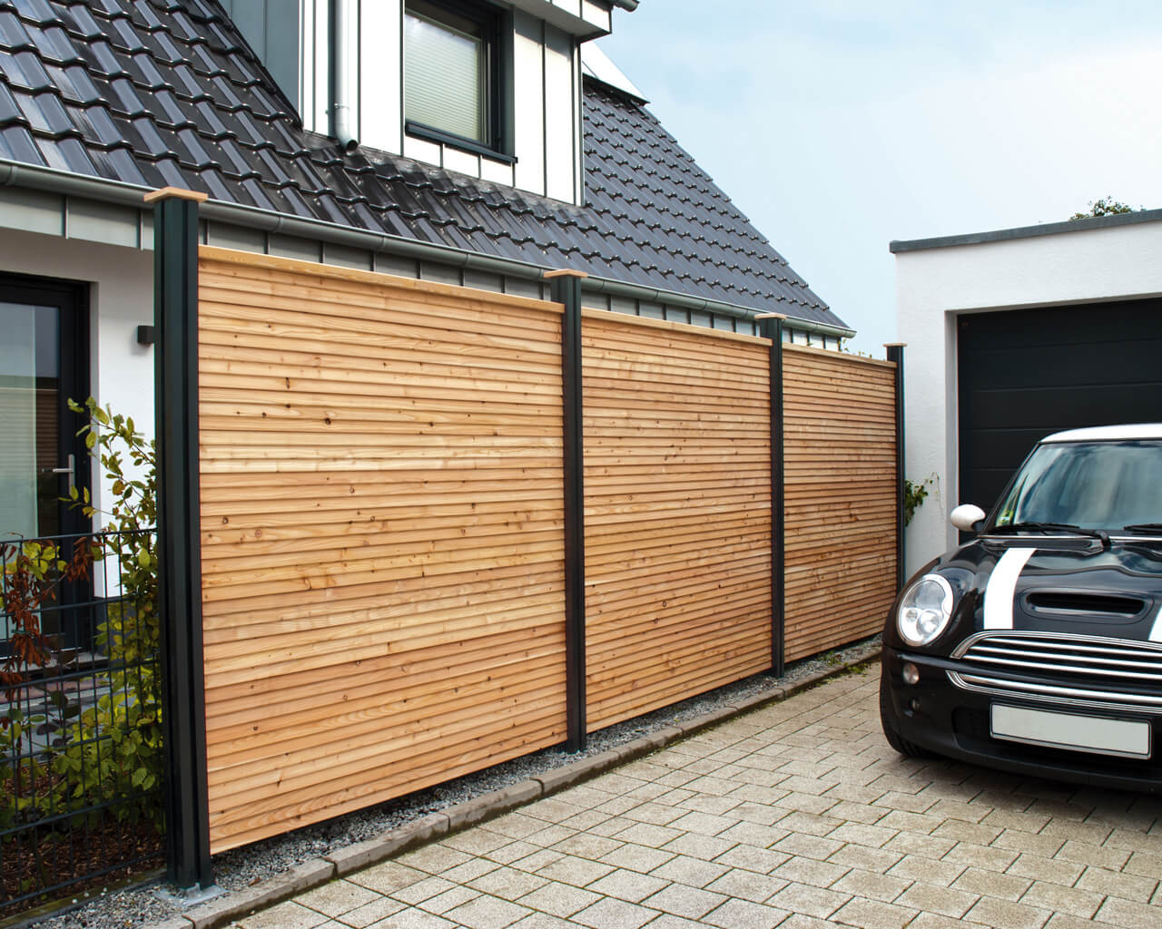 Fügt sich harmonisch in den Außenbereich ein: Die schnörkellose Holzsichtblende passt perfekt zum Stil des Hauses. (Foto: Osmo)