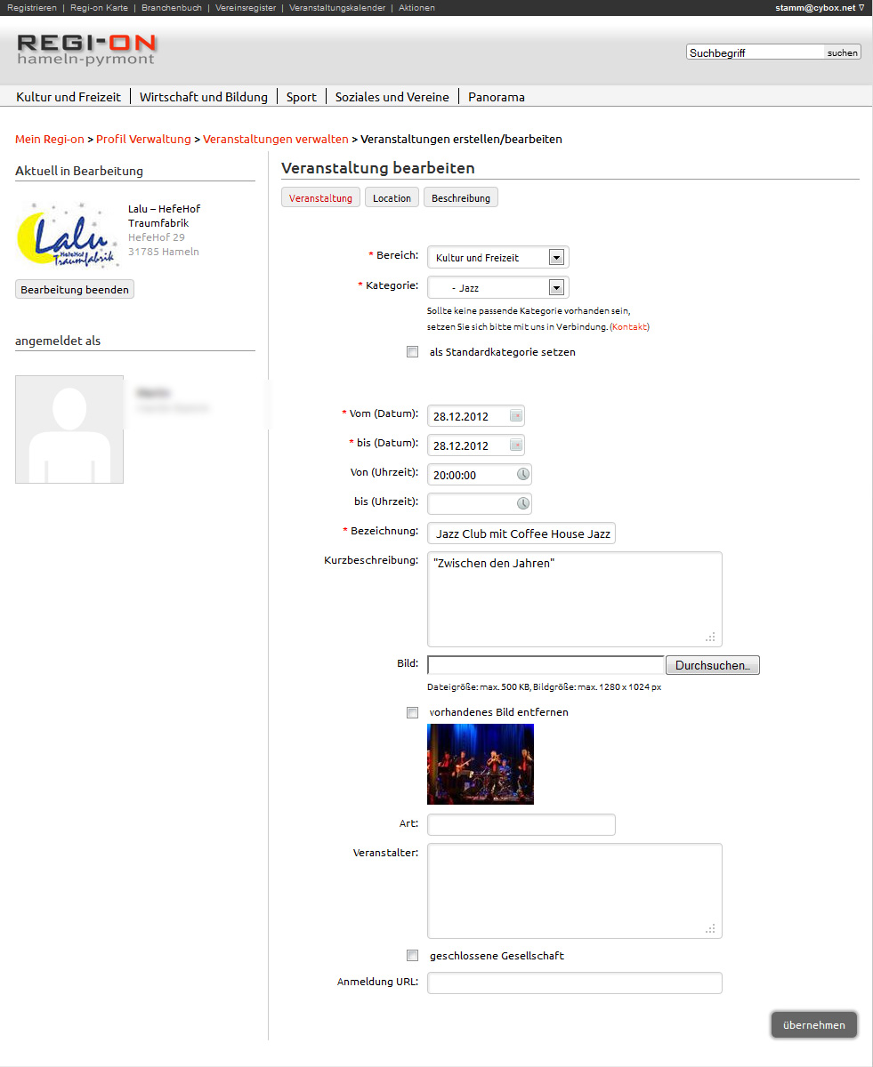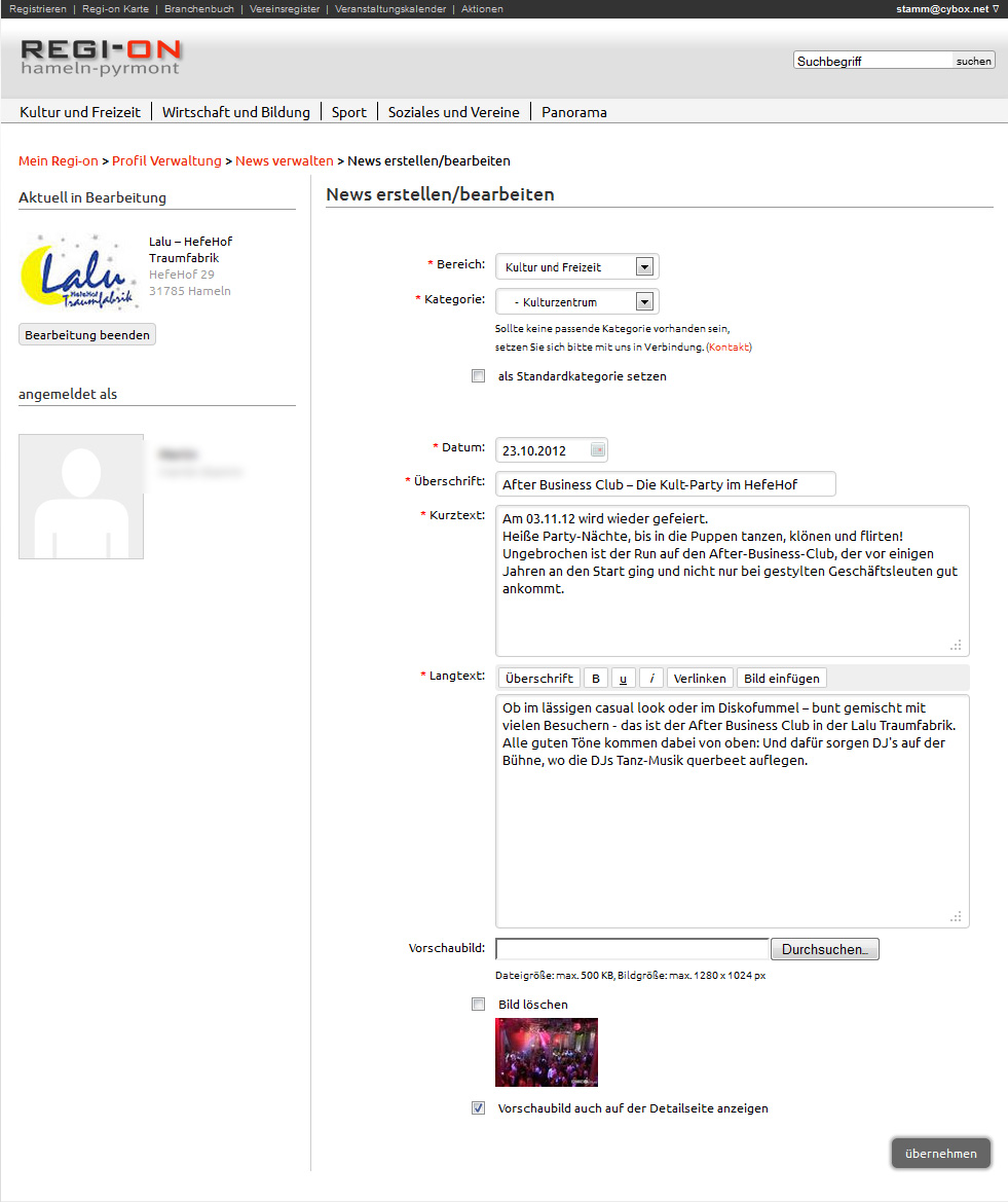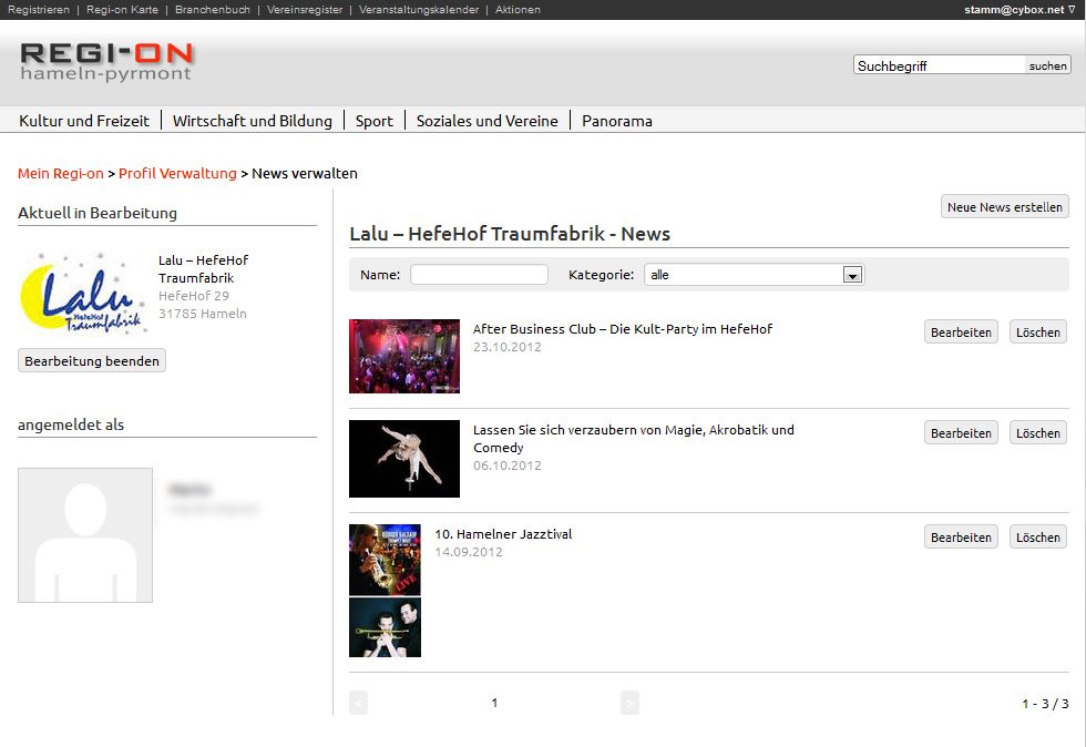 In kürzester Zeit sind beliebig viele Nachrichten und Veranstaltungen über die einfache Benutzeroberfläche von regi-on.de eingestellt. Ihre Nachrichten werden automatisch mit Ihrem Profil und Ihren Kontaktdaten verknüpft.