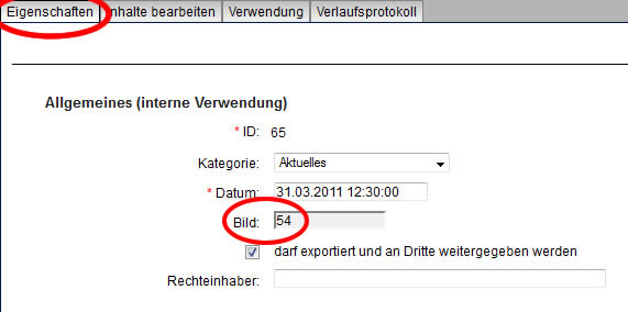 Dann tragen Sie unter Eigenschaften zur News einfach die ID des Bildes ein und bestätigen diese Ergänzung mit OK.