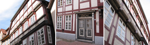 Das Fachwerk ist mit Fächerrosetten und Flechtbändern verziert. Perlstäbe und Taubenbänder befinden sie auf den Füllhölzern und Schwellen.