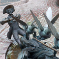 Hier stellt ein Brunnen gleich drei der berühmten Lügengeschichten des Barons von Münchhausen dar.