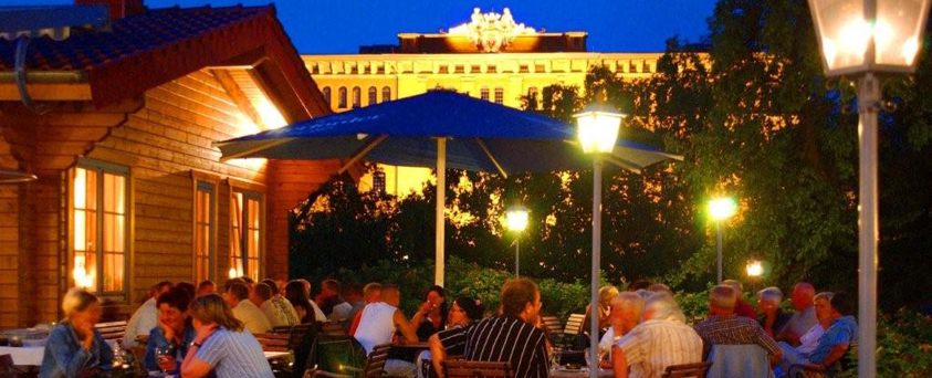 Die große Sonnenterrasse mit 150 Sitzplätzen ist nach Süden und Westen ausgerichtet. Von hier können Sie bei schönem Wetter den Sonnenuntergang beobachten oder dem Treiben im Biergarten zuschauen.