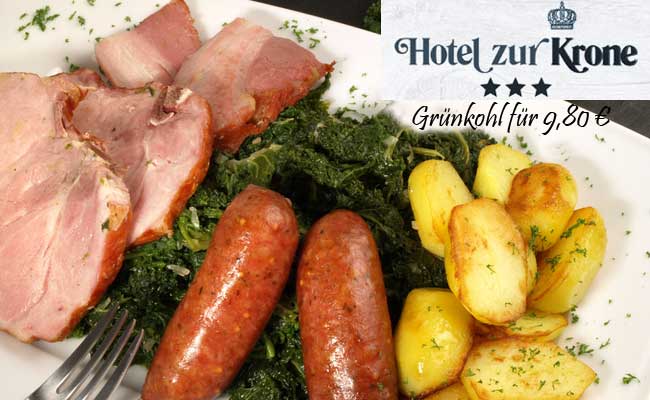 Grünkohl mit Kohlwurst & Kasseler sowie Salzkartoffeln zum Preis von € 9,80.
