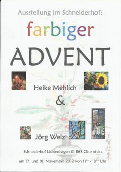 Die Ausstellung "Farbiger Advent" können Sie Samstag und Sonnntag jeweils von 11 bis 18 Uhr bei uns besuchen.