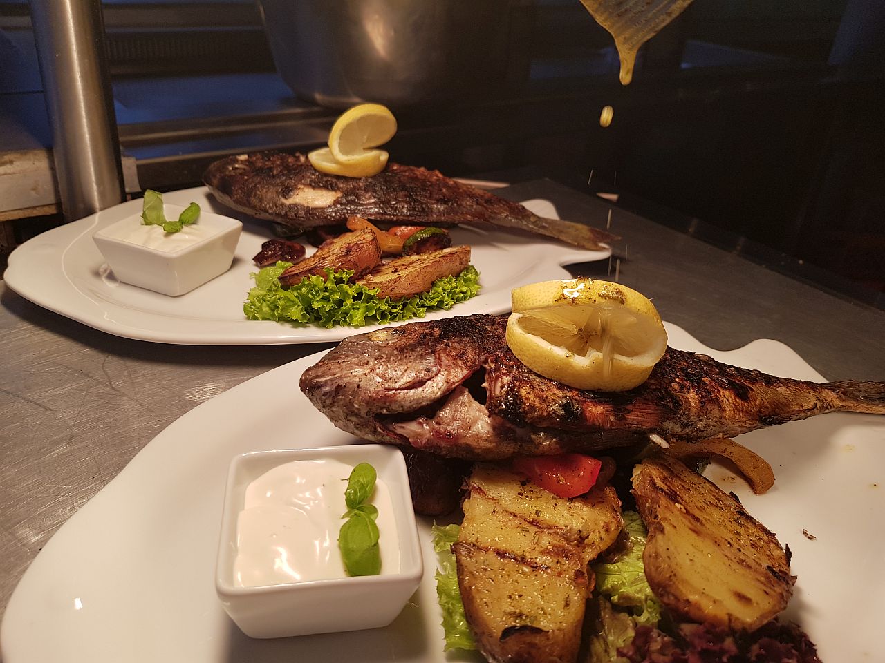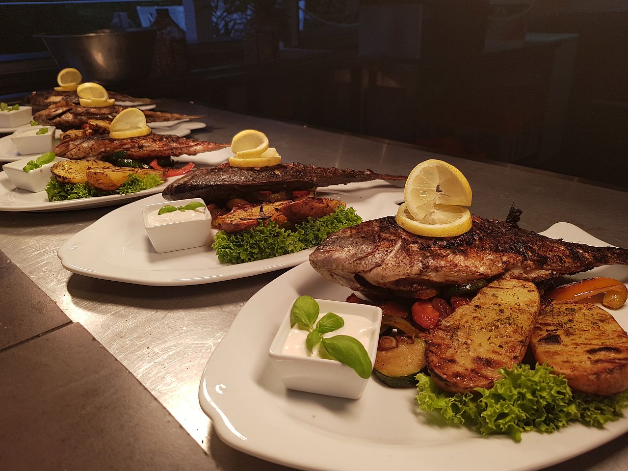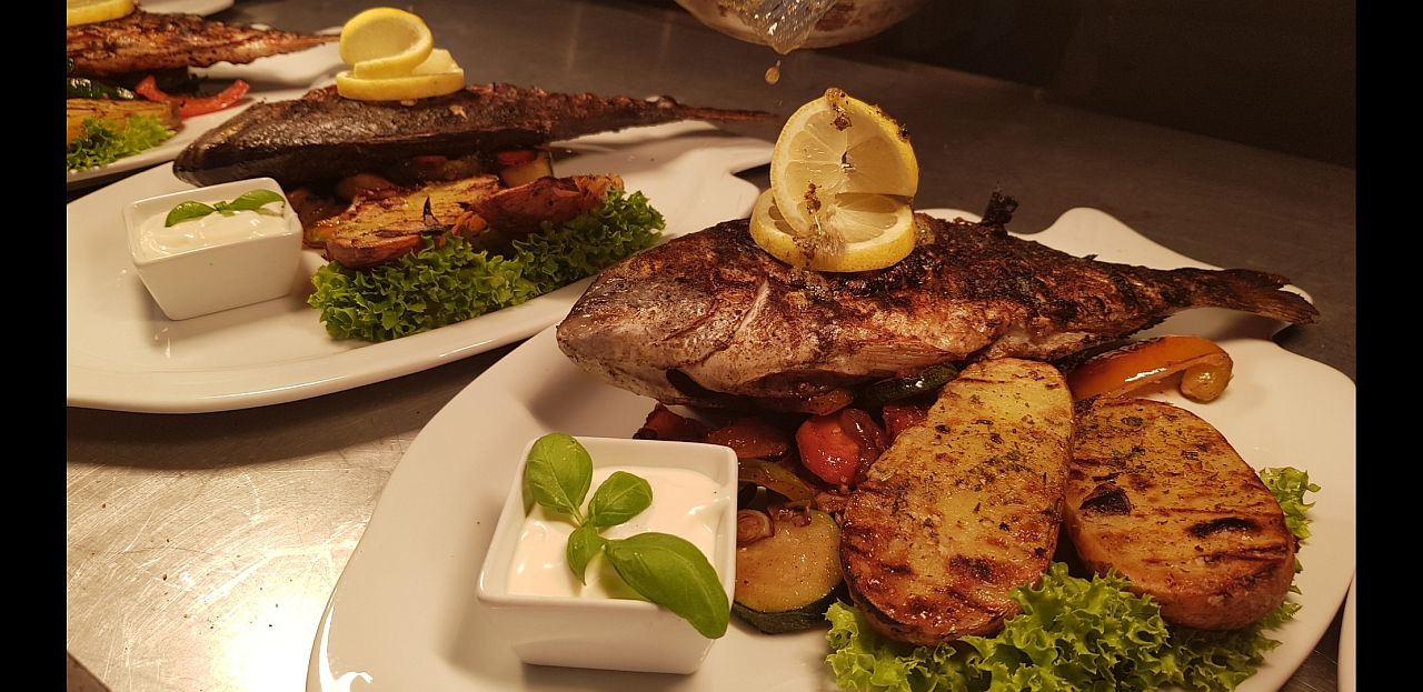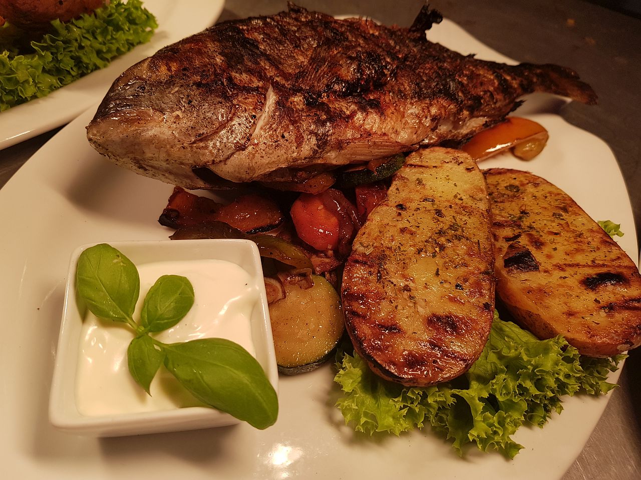 Immer frisch zubereitet, bekommt die mit einer Zitronen-Kräutermarinade angerichtete Dorade, bei uns die besondere Note vom Holzkohlegrill. Hierzu reichen wir mediterranes Gemüse, gebackene Kartoffeln und einen passenden Dip.