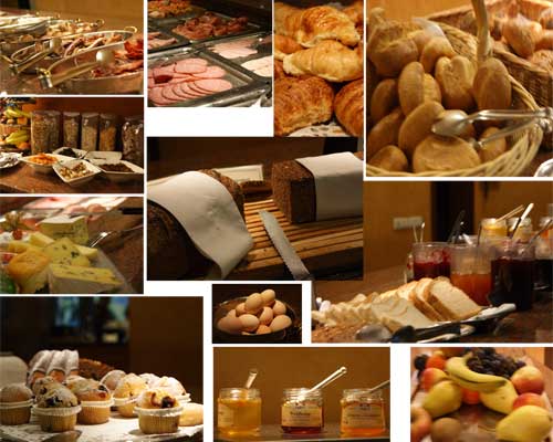 Auch für den süßen Zahn gibt es reichlich Plundergebäck, Mini-Croissants, Brioche, Toast- und Knäckebrot, Kuchen, Konfitüren und Honig und eine große Auswahl Konfektüre.
