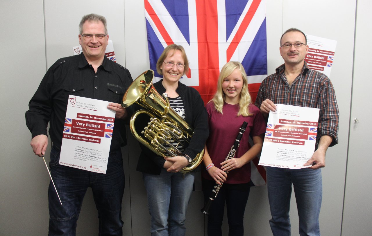 Vorfreude auf „Very British!“ (v. l.): Dirigent Lutz Göhmann, Annette Menzel (Stammorchester), Tabea Sempf (Jugendorchester) und Boris Müller, 1. Vorsitzender, laden stellvertretend zum Jahreskonzert des Musikkorps am 24.11.12 um 19:30 Uhr ein.
