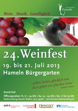 Vom 19.07. - 21.07.2013 sind Wein- und Gourmetliebhaber von nah und fern zum 24. Hamelner Weinfest wieder in den Hamelner Bürgergarten eingeladen.