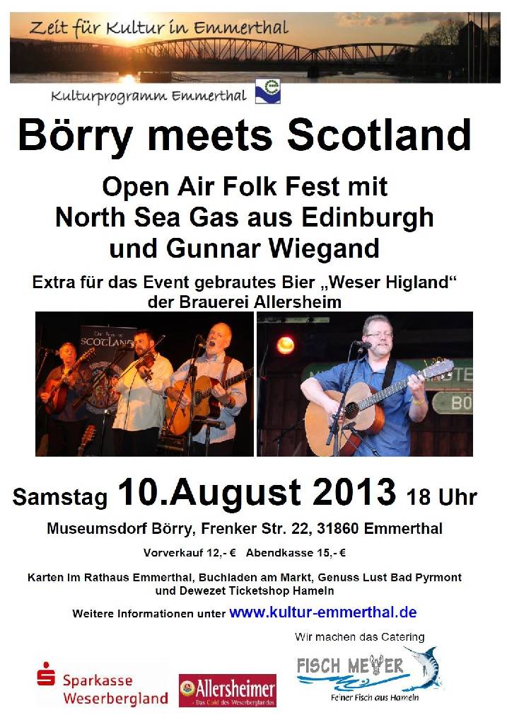 Irgendwie sind sie schon legendär, die Open Air Festivals von „Zeit für Kultur in Emmerthal“ im Museum für Landtechnik und Landarbeit in Emmerthal-Börry. 2011 begeisterte die „Nordische Nacht“ mit Godewind, 2012 das Country-Festival „Börry goes Nashville“. Jedes Mal volles Haus bei super Musik und den passenden kulinarischen Köstlichkeiten in dem tollen Ambiente des Emmerthaler Museumsdorfes. Für diesen Sommer ist mit „Börry meets Scotland“ am 10. August ein ganz besonderer Leckerbissen für alle Sinne in Vorbereitung.