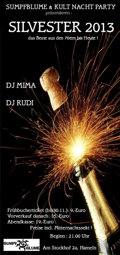 In Zusammenarbeit mit den Machern der Kult Nacht-Partys wird sich alles um die Musik der letzten 3 ½ Dekaden drehen. Von der Disco-Epoche der 70er über New Wave, Pop, Rock, NDW, Indie, Grunge, Funk, Soul bis hin zu aktuellen Beats der letzten Jahre. Die gesamte Bandbreite an Musik wird in dieser Nacht standesgemäß abgefeuert. Die DJs Rudi und Mima werden nach einer längeren Pause wieder mit dem Besten aus allen Bereichen der Musik die Tanzfläche beschallen. Jeder soll auf seine Kosten kommen und diese Silvester-Party in vollen Zügen genießen. Für eine Raucherlounge ist ebenso gesorgt wie für den Mitternachts-Sekt zur Jahreswende! Kein großer Aufriss mit Buffet oder dergleichen. Einfach eine Party, bei der das Feiern und Tanzen im Vordergrund steht.
