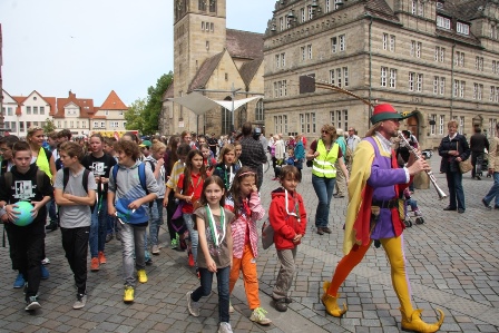 Beim weltgrößten Kinderauszug waren weltweit 2500 Kinder in neun Ländern auf vier Kontinenten unterwegs. Insgesamt fanden in zwölf Städten Kinderauszüge statt. Auf der Strecke von Hameln über Tündern bis Emmerthal gab es Snacks und Getränke von vielen fleißigen Helfern, so auch in Emmerthal, wo Emmerthals Bürgermeister Andreas Grossmann die Kinder begrüßte.
