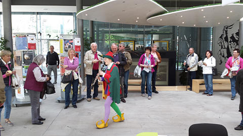23.4. Anna Leas Generalprobe für eine Begrüßung im Infocenter: Es fand ein kleiner Durchlauf statt, das hieß für sie umziehen im Untergeschoss, dann den Moment abpassen und unverhofft in die Lobby vom Infocenter eintreten, die Gäste musikalisch begrüßen und mit dem Gedicht „Der Fahrende“ auf ihren Hameln-Besuch einstimmen. Bei schönem Wetter werden die Gäste raus in den Bürgergarten und zur Musik-Muschel geführt. Natürlich gehört ein Blick auf den Koppenberg gerichtet, der sich in östlicher Richtung die Deisterstraße hinab befindet.