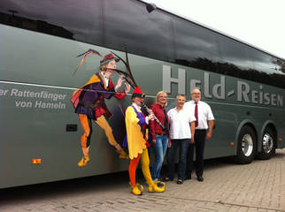 „Der sieht wirklich richtig gut aus“, befindet Anna Mundhenk über die mobile Variante. Quer durch die Lande fährt das Hessisch Oldendorfer Bus-Unternehmen. Dabei stehen Kurztrips nach Ostfriesland, der Taunus, der Thüringer Wald, oder ein bayerisches Schmankerl-Wochenende, die Mosel, die Loreley und Rügen neben vielen Tagestouren auf dem Programm. Zudem fährt Held mit zwei Fernreisebussen die Linien Münster - Osnabrück - Hannover - Berlin sowie Hameln - Hannover - Magdeburg. So kommen der Baxmann und der Rattenfänger ganz schön rum – frei nach dem Motto „Sehen und gesehen werden“.