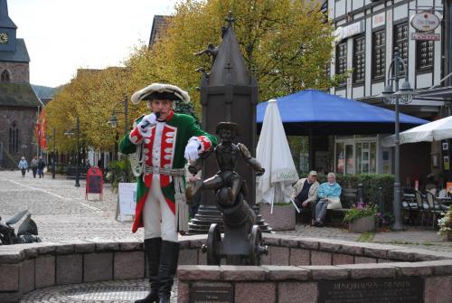 Am Münchhausen-Brunnen in der Innenstadt spielen die Münchhausen-Musikanten auf.