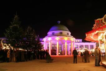 Stimmungsvoll beleuchtet und weihnachtlich geschmückt – so präsentiert sich der Bad Pyrmonter Weihnachtsmarkt, vom 27. November bis zum 23. Dezember im Herzen der Stadt, auf dem Brunnenplatz.
