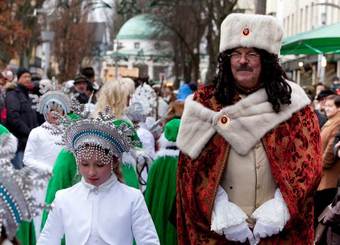 Eisprinzessinnen in Fantasiekostümen zu Pferde sowie in Begleitung von Eisprinzen ziehen mit Schlitten und Laternen in einem Festumzug ""Petersburger Schlittenfahrt"" am Sonntag um 14.30 Uhr zu Ehren des Gastes ""Zar Peter der Große"" durch die Stadt. Der Besucher erlebt ein Festprogramm an allen drei Tagen.