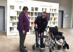 Neuerdings hält die Touristinfo Hameln einen Rollator und einen Rollstuhl für Tages-ausflügler vor. Das Hamelner Sanitätshaus Meyer stellte die komfortablen Gehhilfen bereit.