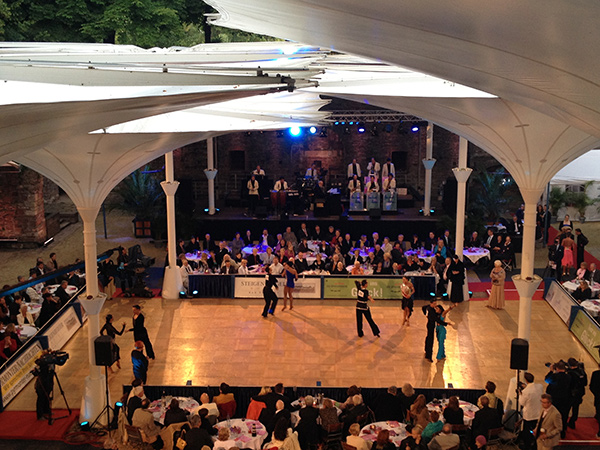 Mitten im romantischen Ambiente des großen Schlosshofes, direkt unter den großen Schirmen wird ein Tanzparkett aufgeschlagen, auf dem internationale Paare ihr Können im lateinamerikanischen Tanz unter Beweis stellen werden.