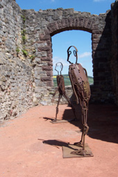 Wer in diesem Jahr die Aussicht von der Poller Burg ins Wesertal genießen möchte, kommt zusätzlich in den Genuss einer interessanten Ausstellung. Weitläufig verteilt auf drei Ebenen des Burggeländes hat der Künstler seine Skulpturen wirkungsvoll platziert. Man meint, die Figuren seien für dieses Gelände angefertigt, so gut passen sie in das Blickfeld über die alten Mauern sowie das bergige Umfeld und das feinfühlig angelegte Innere der Burgruine. Besser könnte das für andere Zwecke ausgediente Material, aus dem Otfried Faul seine zum Teil überlebensgroßen Skulpturen herstellt, nicht passen. Scheint es doch mindestens ein Jahrhundert gebraucht zu haben, um dem verwendeten Material die Patina zu geben, die es so einmalig erscheinen lässt. Wenn man genau hinschaut, wird man mit Erstaunen feststellen, dass es sich dabei um ganz profane Dinge handelt, die dort ein zweites Leben gefunden haben.