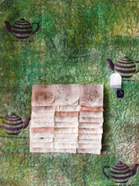 Meine Absicht und Vorgehensweise beim Malen ist, das Alltägliche aus seinem gewohnten pragmatisch funktionalen Zusammenhang heraus in neue Zusammenhänge zu stellen: Das Fremde im Gewohnten hält die Beschäftigung mit dem Alltäglichen in Gang. So gibt es z. B. Assemblagen mit benutzten Kaffeepads oder Teefiltern auf speziell dafür bedrucktem Tuch mit genähten Linien, oder aber Materialcollagen aus alten Zeitungsausrissen mit Zeitungsmotiven bedrucktem Stoff, weiterhin bemalt und durch genähte Linien verbunden usw."