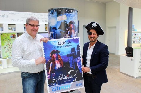 Von der HMT veranstaltet, wird das Erfolgs-Musical aus dem Hause „Spotlight-Musicals“ in der Zeit vom 7.-23. Oktober im Hamelner Theater exklusiv in Deutschland aufgeführt. Die neue „Schatzinsel Briefmarke“ kann für 60 Cent „Standard-Post“ erworben werden. Das reicht für einen Brieftransport bis zu den entlegensten Inseln innerhalb Deutschlands. Sammler von den „Musical-Marken“ dürfte das besonders freuen, denn mit der Motiv-Marke wird die Serie mit den vorangegangenen Abbildungen von „Die Päpstin“ und „Friedrich – Mythos und Tragödie „erweitert.