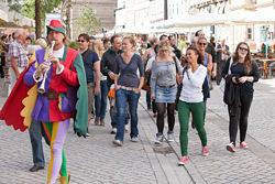 Die Weserrundfahrt genossen 23 Musicalmitarbeiter bei 24 Grad Sonntagswetter – maritimer Hameln-Flair. Am Mittwoch gab es die Stadtführung. Trotz anfänglich trüben Wetters und nur 19 Grad konnte der Rattenfänger, Michael Boyer, den 20 Personen starken „Päpstin-Tross“ mit einer dramaturgisch humorvollen Stadtführung herzlich zum Lachen bringen und sie mit seinem verführenden Flötenspiel durch die Stadtgeschichte führen und verzaubern. Sogar das Wetter schlug zum strahlenden Sonnenschein um. Bürgergarten, St. Nikolais Kirche Hochzeitshaus inklusive Glockenspiel, Leisthaus und Bungalosenstraße waren Stationen.