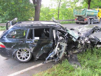total beschädigt BMW ca. 25 Meter entfernt im rechten Seitenraum liegen.