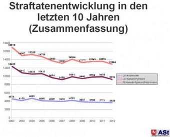 Die Anzahl der im Inspektionsbereich registrierten Straftaten ist zurückgegangen: 12864 Delikte registrierte die Analysestelle der Inspektion insgesamt, davon 9226 Straftaten im Landkreis Hameln-Pyrmont und 3638 im Landkreis Holzminden. Das sind insgesamt 715 Fälle weniger als im Jahr 2011 (minus 5,27%). Betrachtet man einzelne Deliktsbereiche, so weist die Kriminalstatistik für das vergangene Jahr erfreulicherweise einen Rückgang bei der Gewaltkriminalität aus. Nachdem 455 Fälle im Jahr 2011 erfasst wurden, ist die Gewaltkriminalität auf nun 405 Fälle gesunken. Zur Gewaltkriminalität zählt die Inspektion die Straftaten gegen das Leben (Mord, Totschlag (13 Delikte)) sowie gefährliche und schwere Körperverletzungen (392). Der positive Trend eines Rückganges zeigte sich zudem bei den Eigentumsdelikten (Einbruch und Diebstahl, -103 Fälle, jetzt 4361 Delikte) und den Vermögens- und Fälschungsdelikten (Betrug, Veruntreuung, Unterschlagung, -364 Fälle, jetzt 2325 Delikte).