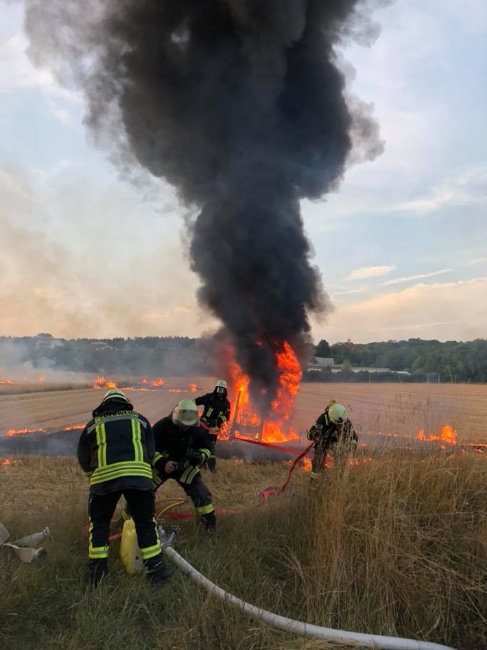 Die Flammen setzten durch Funkenflug die bereits abgesetzten Rundballen und Stoppelfelder im Nahbereich in Brand. Das Feuer breitete sich über eine größere Fläche aus.