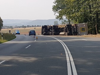 Anlässlich der Bergung von Fahrzeug und Ladung bzw. Reinigung der Fahrbahn wurde eine Vollsperrung der Bundesstraße erforderlich, der Fahrzeugverkehr wird bis in die Abendstunden weiträumig über Stadtoldendorf umgeleitet.