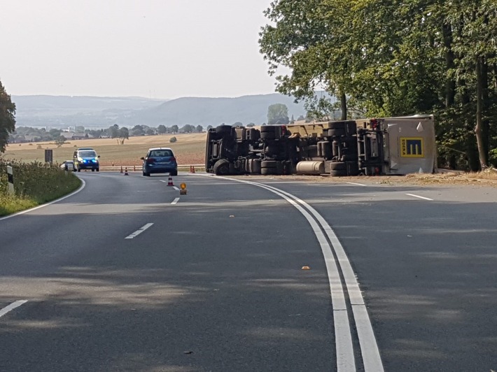 Negenborn / Kratzeberg (ots) - Heute gegen 13:00 Uhr verunfallte ein Sattelzug im Lieferverkehr auf der Bundesstraße B64 zwischen Negenborn und Holzminden. Glücklicherweise entstand lediglich Sachschaden, der 22-jährige Lkw-Fahrer kletterte unversehrt aus der Führerkabine.