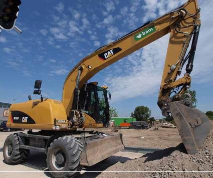 Die Grundfarbe des Baggers ist gelb mit schwarzem Hersteller-Logo "Cat".
