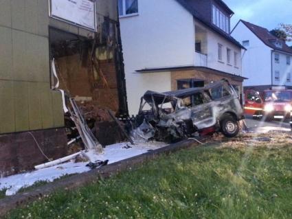 Erst die alarmierte Feuerwehr konnte das Fahrzeug löschen und ein größeres Schadensfeuer am durch Unfall und Fahrzeugbrand stark beschädigten Wohnhaus verhindern.