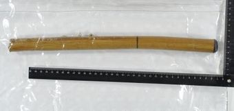 Zudem fanden die Ermittler am Tatort den Gegenstand auf, mit dem der Filialleiter geschlagen und verletzt wurde. Dabei handelt es sich vermutlich um ein altes Stuhl- oder Tischbein. Es ist ein Aluminiumrohr, das mit einem Kunststoffüberzug (in Holzoptik) ummantelt ist.