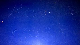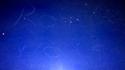 Der in den Lack eingeritzte Schriftzug weist charakteristische Schriftmerkmale auf. Eventuell erkennt jemand anhand der Schriftmerkmale (z. B. geschwungenes "w", schleifenartiger Rückläufer im kleinen "a", das "b" in einem Zug geschrieben,...).