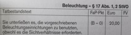 Wer bei Dämmerung und Dunkelheit die vorgeschriebenen Beleuchtungseinrichtungen nicht oder nicht vorschriftsmäßig benutzt riskiert ein Verwarngeld in Höhe von 20 Euro.