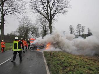 Fahrbahn kam er, vermutlich infolge von nicht angepasster Geschwindigkeit, in einer Rechtskurve ins Schleudern und prallte frontal gegen einen Strassenbaum. Der Fahrer wurde mit den Beinen im Fahrzeug eingeklemmt und der PKW geriet sofort in Brand. Der Fahrzeugführer konnte durch andere Verkehrsteilnehmer und eintreffende Polizeibeamte der Polizeistation Aerzen, die gemeinsam als mutige Ersthelfer vor Ort einschritten, gerade noch aus dem Fahrzeug gezogen werden, bevor der PKW komplett in Brand geriet. Der Fahrzeugführer wurde mit schweren Verletzungen mit einem Rettungshubschrauber in die Medizinische Hochschule Hannover zur weiteren Behandlung geflogen. Ein 53-jähriger Ersthelfer erlitt einen Schock und musste wegen des Verdachts auf Rauchgasvergiftung ebenfalls in ein Krankenhaus verbracht werden. Der Verdacht bestätigte sich jedoch nicht und er konnte das Krankenhaus nach ambulanter Behandlung wieder verlassen. Am PKW entstand Totalschaden. Zeugen des Unfalls und die mutigen Ersthelfer werden gebeten sich bei der Polizeistation Aerzen unter der Telefonnummer 05154-8364 zu melden.