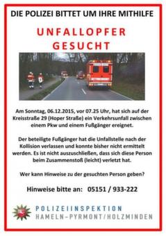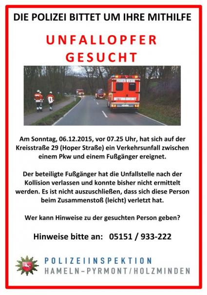 Hameln (ots) - (Hameln) Am Sonntagmorgen kam es auf der Kreisstraße 29 bei Halvestorf zu einer Kollision zwischen einem Pkw und einem Fußgänger. Trotz umfangreicher Suchmaßnahmen konnte das mögliche Unfallopfer bis jetzt nicht aufgefunden werden (wir berichteten bereits in einer Pressemitteilung, siehe unten Link 1).