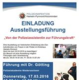 news aktuell GmbH - PolizeiHameln (ots) - Am Donnerstag, den 17.03.2016, lädt die Polizeiinspektion Hameln-Pyrmont/Holzminden zu einer öffentlichen Führung durch die Ausstellung "Von der Polizeiassistentin zur Führungskraft" im Kreishaus Hameln ein. Beginn der gut einstündigen Themenführung durch den Ausstellungskurator Dr. Dirk Götting, Polizeihistoriker der Polizeiakademie Niedersachsen, ist um 15.00 Uhr.