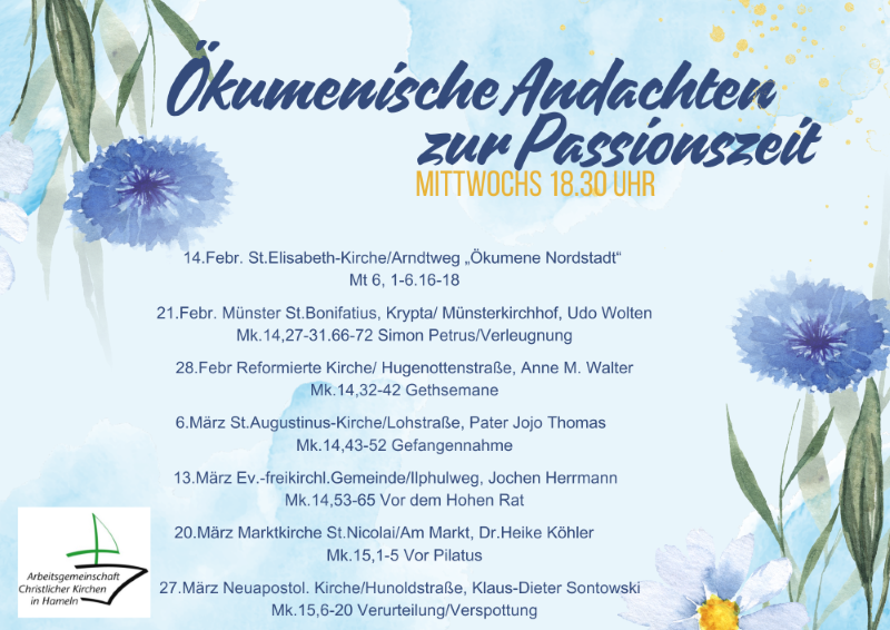 Unter dem "Dach" der Arbeitsgemeinschaft Christlicher Kirchen in Hameln werden 2024 sieben Andachten in verschiedenen Kirchenräumen angeboten. Sie sollen durch die Passionszeit begleiten, jeweils mittwochs um 18.30 Uhr.