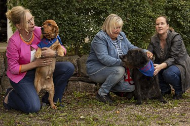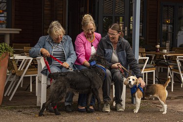 Drei Teilnehmerinnen beim Treffen auf der Insel in Hameln. Von links: Gaby Richard, Britta Redeke, Susanne Sprenger mit den Besuchshunden Molli, Diva und Elvis.