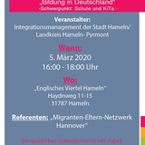 FiZ - Familie im Zentrum - SozialzentrumAm 05.März 2020 um 16:00 Uhr bietet das Integrationsmanagement der Stadt Hameln in Kooperation mit dem Landkreis Hameln-Pyrmont einen Vortrag zum Thema "Bildung in Deutschland" an. Der Schwerpunkt liegt auf dem Bereich "Schule und Kita". Die Veranstaltung findet im Englischen Viertel im Haydnweg 11-15 in 31787 in Hameln statt. Es referiert das Migranten-Eltern-Netzwek Hannover. Die Teilnahme ist ohne Anmeldung möglich und kostenfrei. Ein arabischer Dolmetscher steht zur Verfügung.