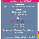 FiZ - Familie im Zentrum - SozialzentrumEinen Vortrag zum Thema "Bildung in Deutschland" bietet das Integrationsmanagement der Stadt Hameln am kommenden Freitag, 17. Januar um 11:00 Uhr im "Treffpunkt KAISERS" an. Es referieren Mitarbeiter_innen des "Migranten-Eltern-Netzwerk Hannover" Die Teilnahme ist kostenfrei, eine Anmeldung ist nicht erforderlich und ein arabischer Dolmetscher ist vor Ort.