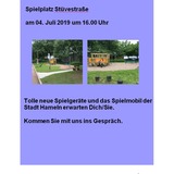FiZ - Familie im Zentrum - SozialzentrumAm 04. Juli um 16:00 Uhr ist es soweit: Oberbürgermeister Claudio Griese eröffnet den neu gestalteten Kinderspielplatz in der Stüvestraße. Eingeladen sind Hamelner Familien mit ihren Kindern, um die tollen neuen Spielgeräte auszuprobieren. Zudem steht das städtische Spielmobil mit vielen weiteren Attraktionen bereit.