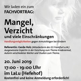 FiZ - Familie im Zentrum - SozialzentrumDas Bündnis gegen Kinderarmut im Landkreis Hameln-Pyrmont lädt interessierte Fachpersonen am 20. Juni um 17:00 Uhr zu einem Fachvortrag mit dem Titel "Mangel, Verzicht.... und viele Einschränkungen! Handlungsmöglichkeiten gegen Armutsfolgen bei Kindern" ein. Als Referentin konnte Gerda Holz als ausgewiesene Expertin in der Forschung zum Thema Kinderarmut und Autorin verschiedener Bücher und Studien zu diesem Thema gewonnen werden. Sie ist zudem Mitarbeiterin des ISS Frankfurt a.M..