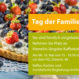 FiZ - Familie im Zentrum - SozialzentrumAuch in diesem Jahr dürfen sich alle Hamelner Bürgerinnen und Bürger am Mittwoch, 16. Mai wieder auf die längste "Open Air- Kaffeetafel" in unserer Stadt freuen. Anlässlich des "Internationalen Tags der Familie" werden von vielen sozialen Einrichtungen zwischen 15:00 und 16:30 Uhr wieder Kaffee und Kuchen gratis unter freiem Himmel angeboten. In gemütlicher Atmosphäre mit Klavierbegleitung und netten Gesprächen sind alle eingeladen, bei hoffentlich schönstem Sonnenschein und direkt vor dem FiZ, die angebotenen Leckereien zu genießen.