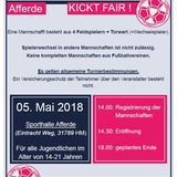 FiZ - Familie im Zentrum - SozialzentrumUnter der Schirmherrschaft von Oberbürgermeister Claudio Griese findet am Samstag, den 05.Mai von 14:00 bis 18:00 Uhr in Afferde der 12. Jugendfußball-Cup statt. Angesprochen sind Jugendliche im Alter von 14-21 Jahren, die Spaß am Kicken haben. Spielort ist die Sporthalle Afferde, Eintracht Weg. Pro Mannschaft gibt es vier Feldspieler_innen + Torwart. Bei diesem Turnier handelt es sich um eine Kooperationsveranstaltung des Caritasverbandes im Weserbergland e.V., der Stadt Hameln, Abt. Familie und Soziales, Regenbogen und Jugendtreffpunkt Afferde.