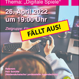 Leider fällt die geplante Veranstaltung zum Thema "Digitale Spiele" am 26. April 2022 aus. Wir werden sie schnellst möglich sowohl hier als auch bei Facebook informieren, wann die Veranstaltung nachgeholt wird.