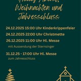Katholische Pfarrgemeinde St. Johannes Baptist - Katholische KircheDas Jahr 2025 neigt sich dem Ende zu. Anbei finden Sie eine Übersicht über die Feierlichkeiten zu Heilig Abend, den Weihnachtstagen und zum Jahresschluss.